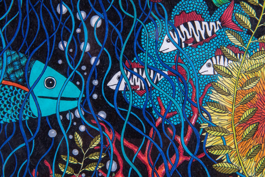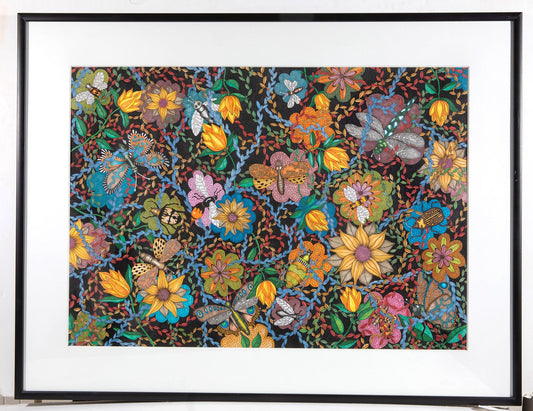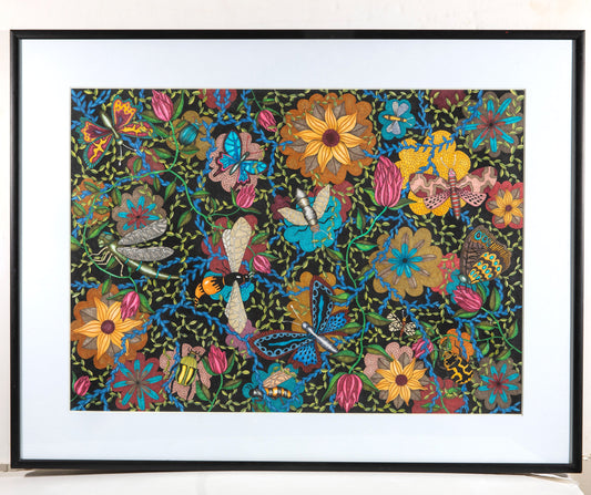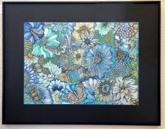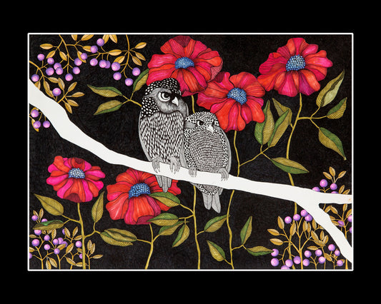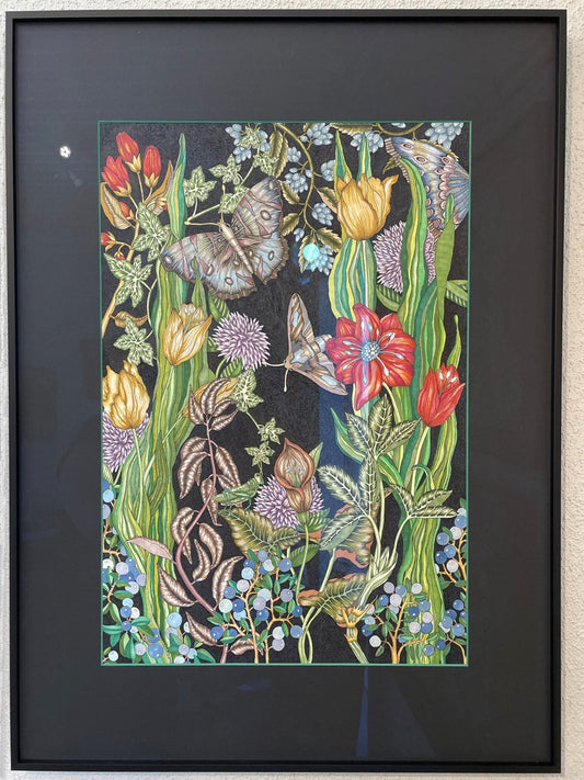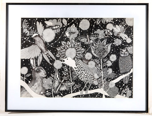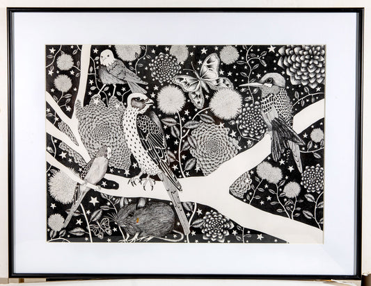 Mina teckningar gör jag i tusch. Jag använder oftast Promarker eller Copic för att färglägga teckningarna, men till konturlinjer och svarta bakgrunder använder jag en tunn tuschpenna med 0,4 eller 0,5 mm spets. Det tar lite tid att fylla bakgrunden på ett helt ark med en så tunn penna. Men på så sätt får jag precis den exakthet och den svärta som jag vill ha. Att fylla ett helt papper med små små streck är nästan som meditation för mig. Vill du se mina originalmålningar kan du klicka här. Vill du se alla mina målningar och teckningar hittar du dem samlat här under originalkonst.