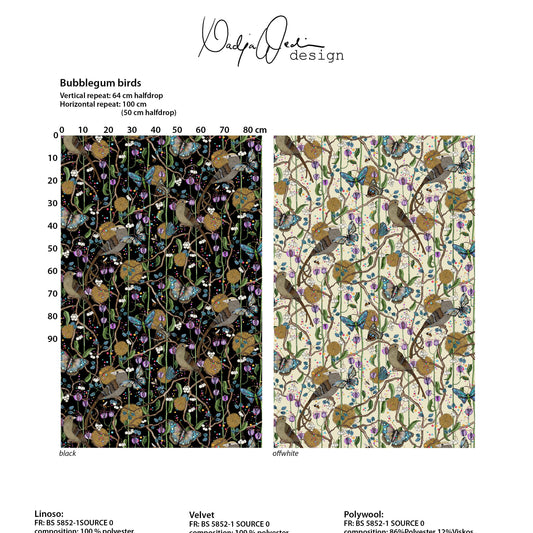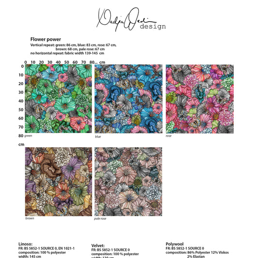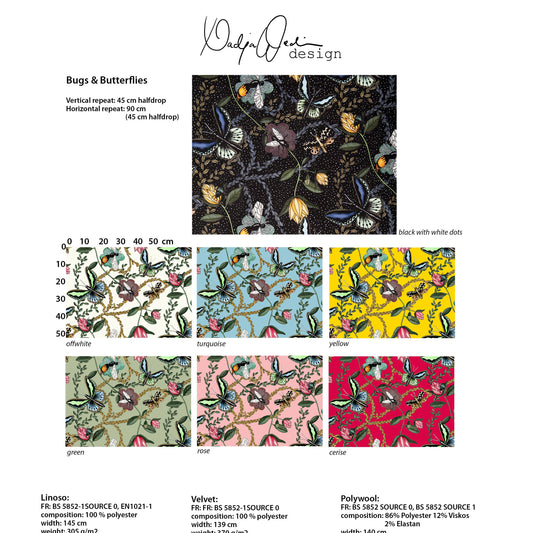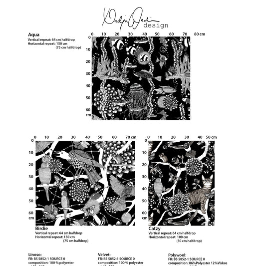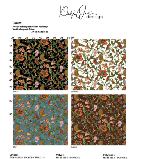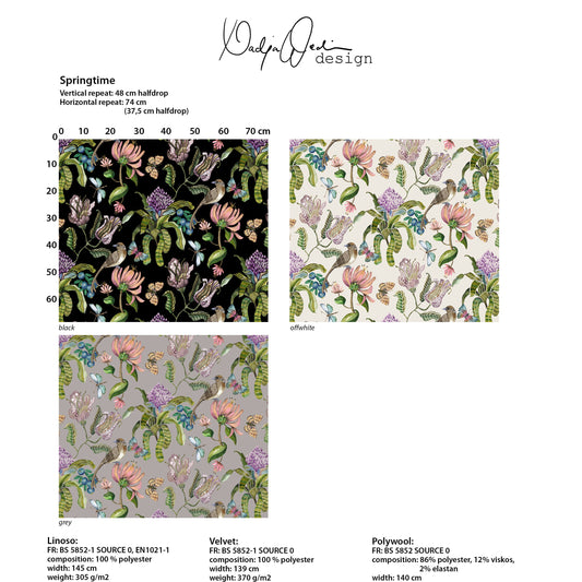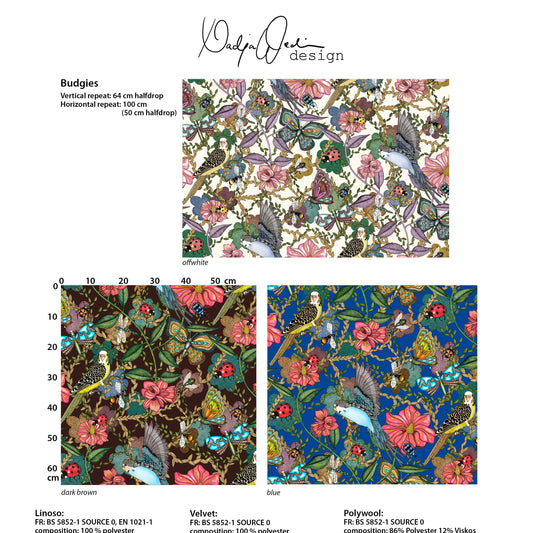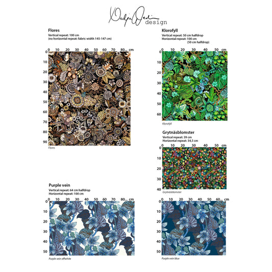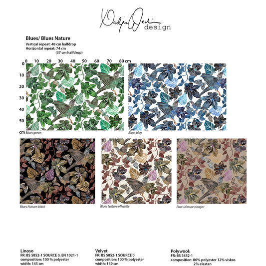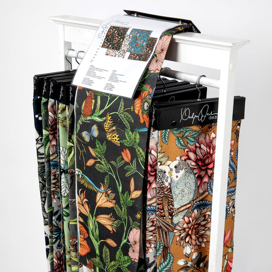 Tyghängare från Nadja Wedin består av en mönsterrapport av varje mönster och färgvariant i kvalitén möbelsammet, samt tryckprov på mönstret i ytterligare två möbeltyger: Linoso och Polywool.